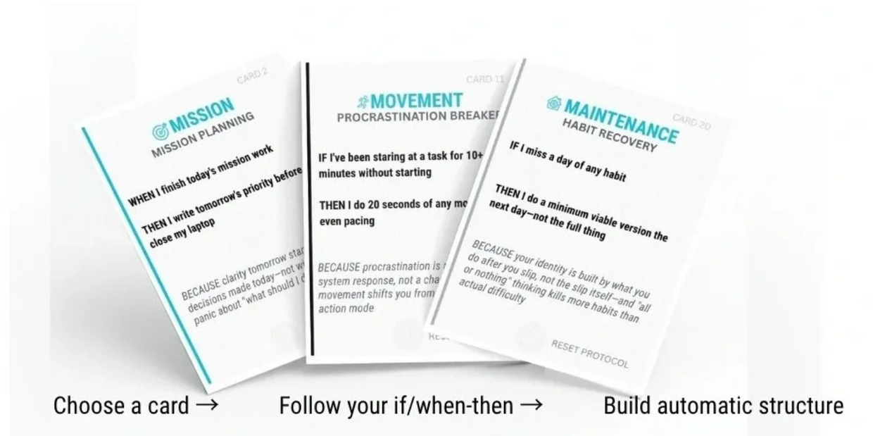 Reset Cards translate good intentions into action cues. You already know what matters—these cards remove the pause between knowing and doing. Each card is a ready-made trigger and an If/When-Then plan that gets you moving when your brain hesitates.